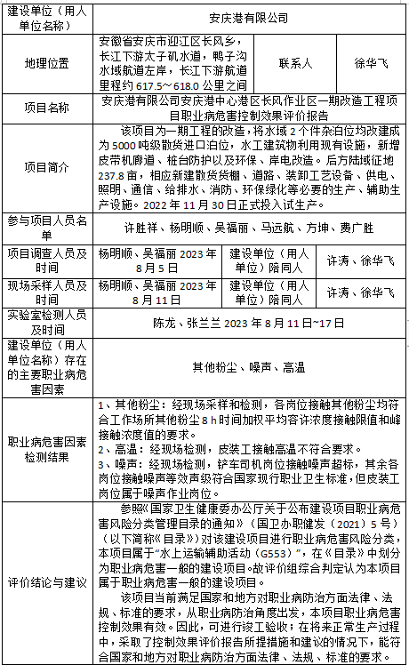 安慶港有限公司安慶港中心港區(qū)長風作業(yè)區(qū)一期改造工程項目職業(yè)病危害控制效果評價報告