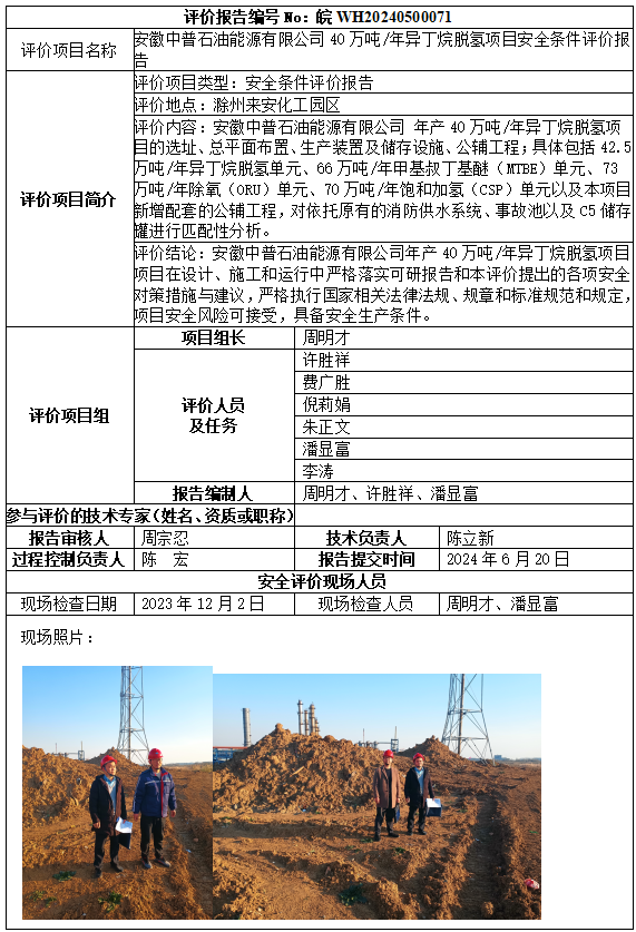 安徽中普石油能源有限公司40萬(wàn)噸/年異丁烷脫氫項(xiàng)目安全條件評(píng)價(jià)報(bào)告