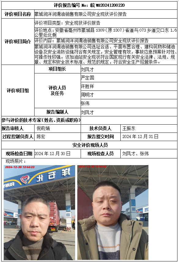 蒙城潤洋潤滑油銷售有限公司安全現(xiàn)狀評價報告