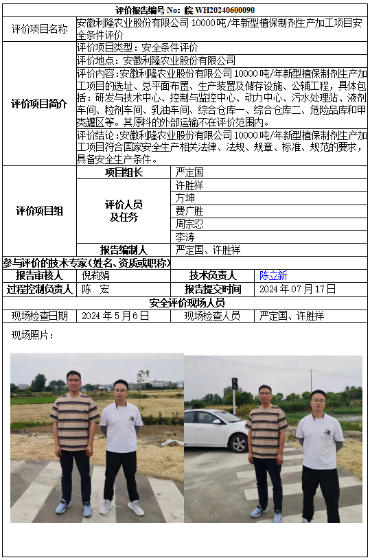 安徽利隆農(nóng)業(yè)股份有限公司10000噸/年新型植保制劑生產(chǎn)加工項(xiàng)目安全條件評(píng)價(jià)