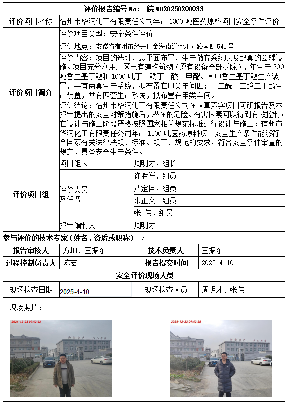 宿州市華潤(rùn)化工有限責(zé)任公司年產(chǎn)1300噸醫(yī)藥原料項(xiàng)目安全條件評(píng)價(jià)