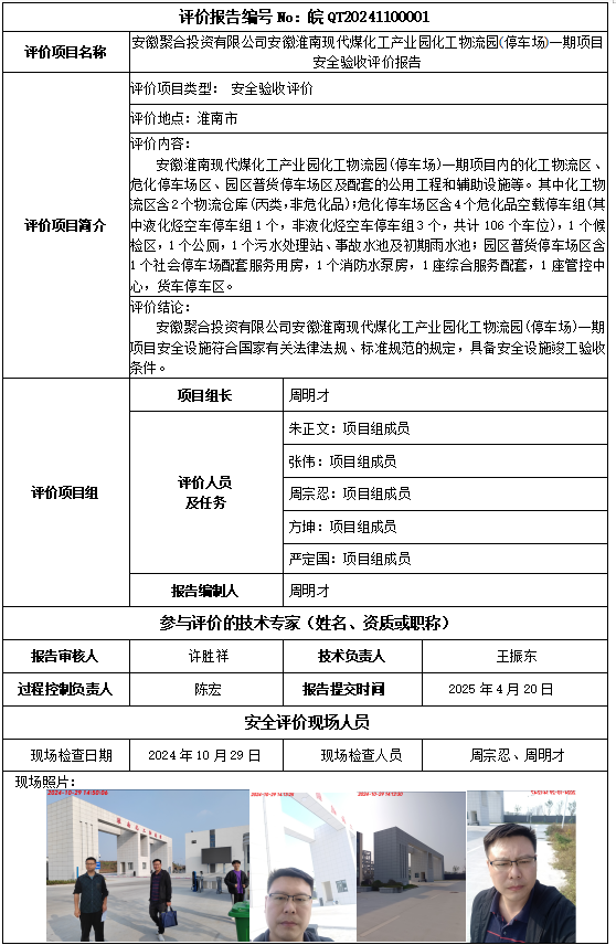 安徽聚合投資有限公司安徽淮南現(xiàn)代煤化工產(chǎn)業(yè)園化工物流園(停車場)一期項(xiàng)目 安全驗(yàn)收評價(jià)報(bào)告