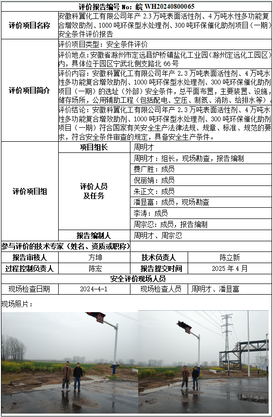 安徽科翼化工有限公司年產(chǎn)2.3萬噸表面活性劑、4萬噸水性多功能復(fù)合增效助劑、1000噸環(huán)保型水處理劑、300噸環(huán)保催化助劑項目(一期)安全條件評價報告