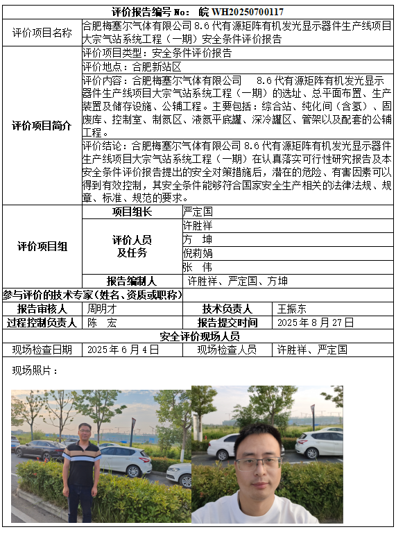 合肥梅塞爾氣體有限公司8.6代有源矩陣有機(jī)發(fā)光顯示器件生產(chǎn)線項(xiàng)目大宗氣站系統(tǒng)工程(一期)安全條件評價報告