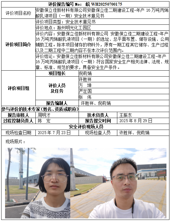 安徽保立佳新材料有限公司安徽保立佳二期建設(shè)工程-年產(chǎn)16萬(wàn)噸丙烯酸乳液項(xiàng)目(一期)安全技術(shù)意見(jiàn)書(shū)
