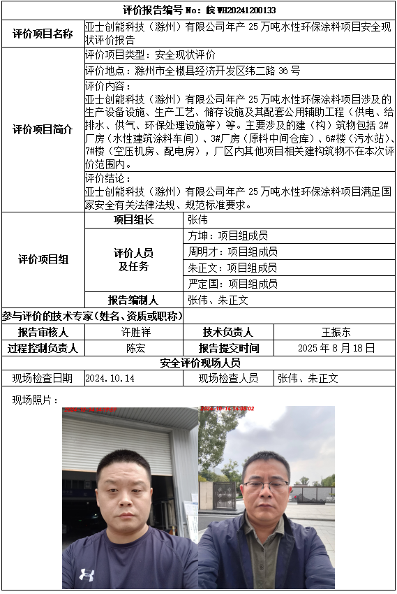 亞士創(chuàng)能科技(滁州)有限公司年產(chǎn)25萬噸水性環(huán)保涂料項目安全現(xiàn)狀評價報告
