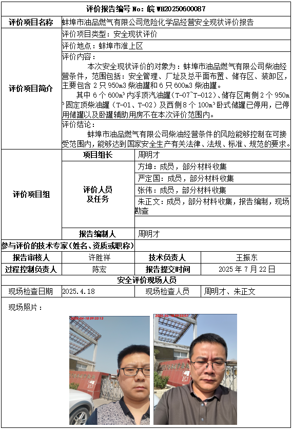 蚌埠市油品燃?xì)庥邢薰疚kU化學(xué)品經(jīng)營安全現(xiàn)狀評價報告