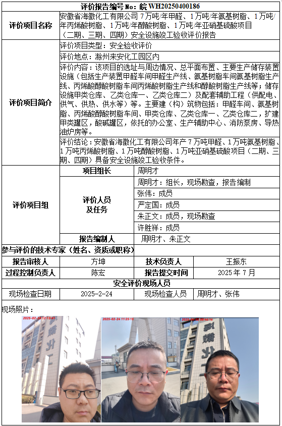 安徽省?;栈び邢薰?萬(wàn)噸/年甲醛、1萬(wàn)噸/年氨基樹(shù)脂、1萬(wàn)噸/年丙烯酸樹(shù)脂、1萬(wàn)噸/年醇酸樹(shù)脂、1萬(wàn)噸/年亞硝基硫酸項(xiàng)目 (二期、三期、四期)安全設(shè)施竣工驗(yàn)收評(píng)價(jià)報(bào)告