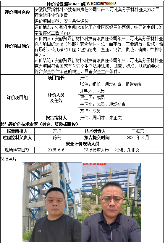 安徽聚界新材料科技有限責(zé)任公司年產(chǎn)2萬噸高分子材料亞克力項(xiàng)目 安全條件評價報告