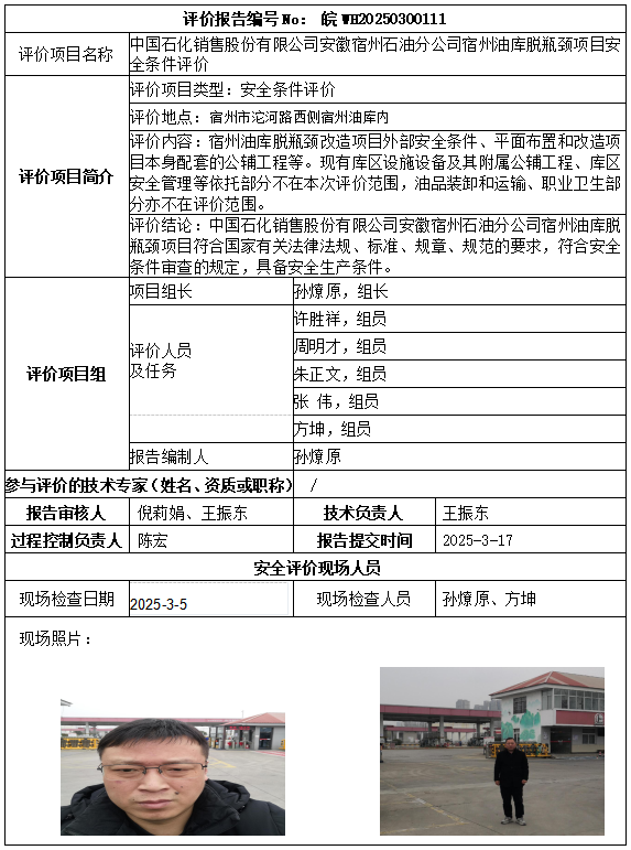 中國(guó)石化銷售股份有限公司安徽宿州石油分公司宿州油庫(kù)脫瓶頸項(xiàng)目安全條件評(píng)價(jià)