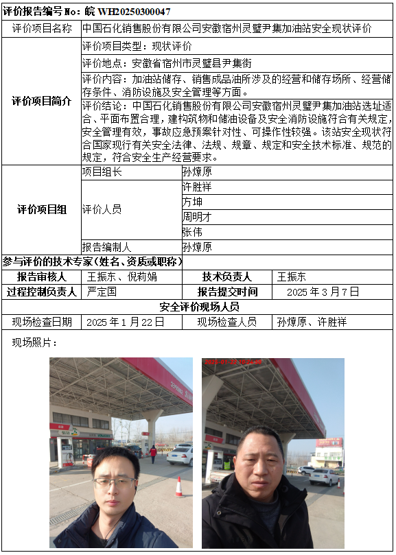 中國(guó)石化銷售股份有限公司安徽宿州靈璧尹集加油站安全現(xiàn)狀評(píng)價(jià)