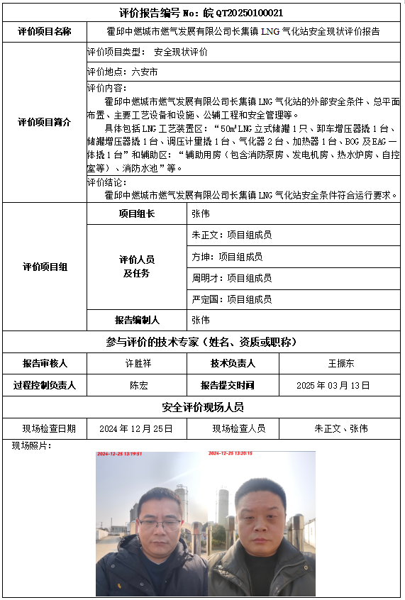 霍邱中燃城市燃?xì)獍l(fā)展有限公司長(zhǎng)集鎮(zhèn)LNG氣化站安全現(xiàn)狀評(píng)價(jià)報(bào)告