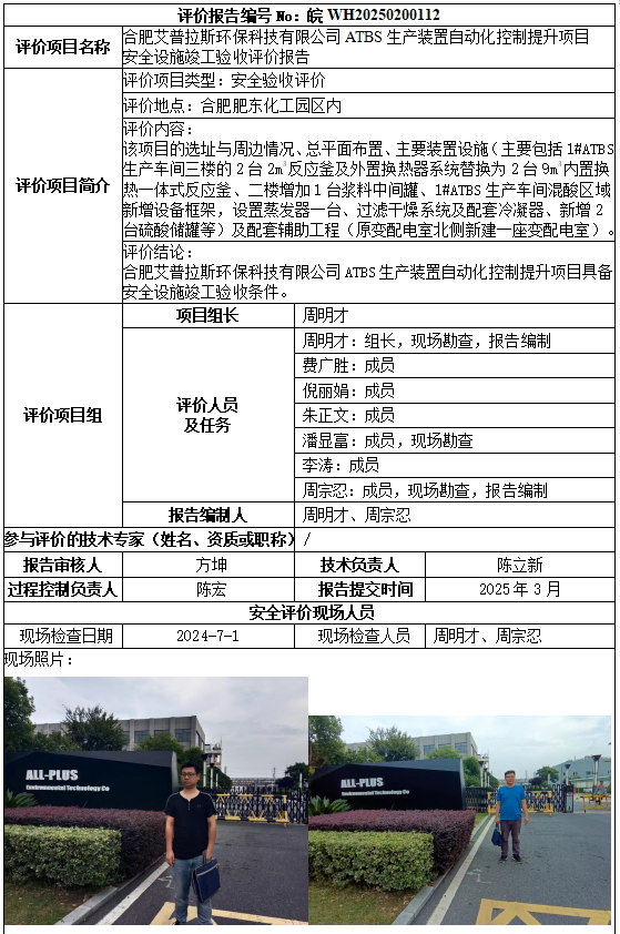 合肥艾普拉斯環(huán)保科技有限公司ATBS生產(chǎn)裝置自動化控制提升項目 安全設(shè)施竣工驗收評價報告
