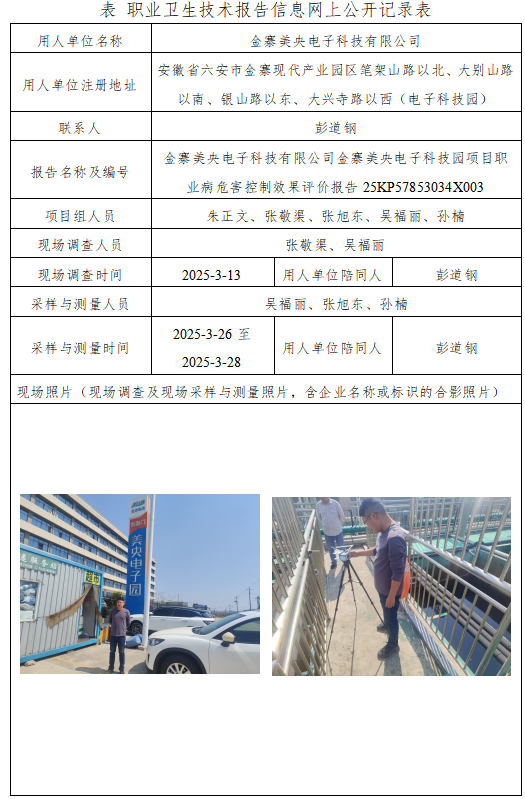 金寨美央電子科技有限公司金寨美央電子科技園項目職業(yè)病危害控制效果評價報告