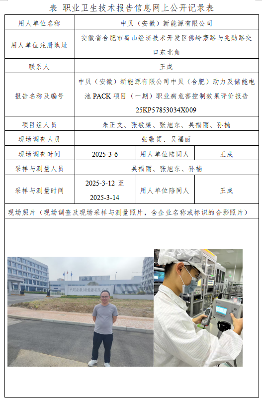 中貝(安徽)新能源有限公司中貝(合肥)動力及儲能電池PACK項目(一期)職業(yè)病危害控制效果評價報告