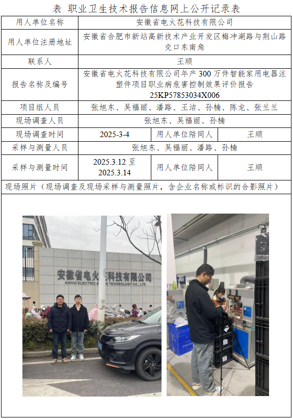 安徽省電火花科技有限公司年產(chǎn)300萬件智能家用電器注塑件項(xiàng)目職業(yè)病危害控制效果評(píng)價(jià)報(bào)告