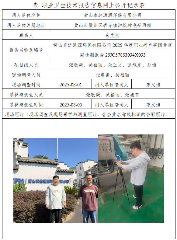 黃山泰達(dá)通源環(huán)保有限公司2025年度職業(yè)病危害因素定期檢測報告