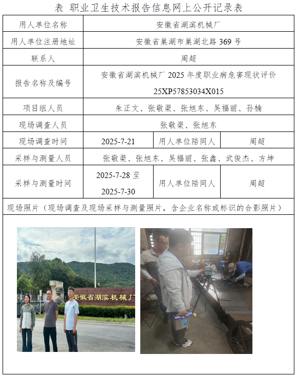 安徽省湖濱機(jī)械廠2025年度職業(yè)病危害現(xiàn)狀評(píng)價(jià)報(bào)告