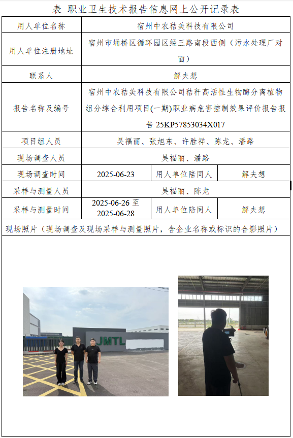 宿州中農(nóng)秸美科技有限公司秸稈高活性生物酶分離植物組分綜合利用項目(一期)職業(yè)病危害控制效果評價報告