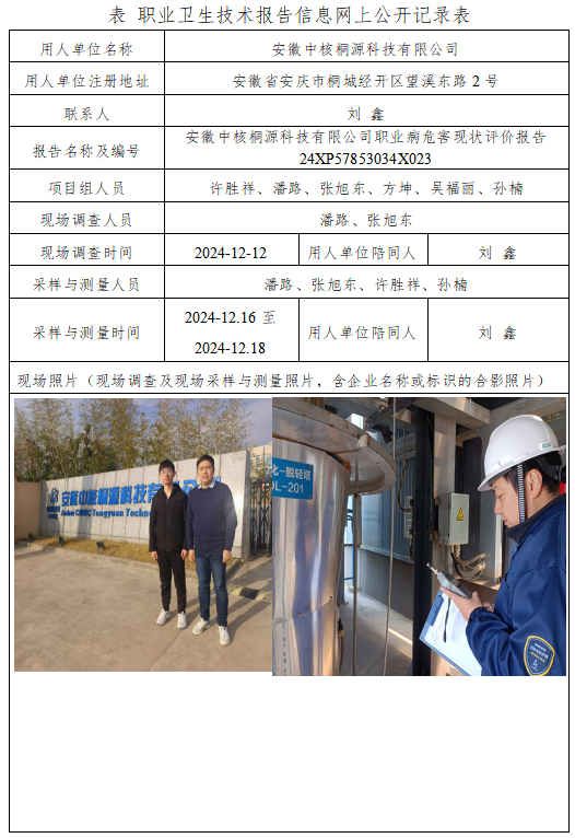 安徽中核桐源科技有限公司職業(yè)病危害現(xiàn)狀評價報告