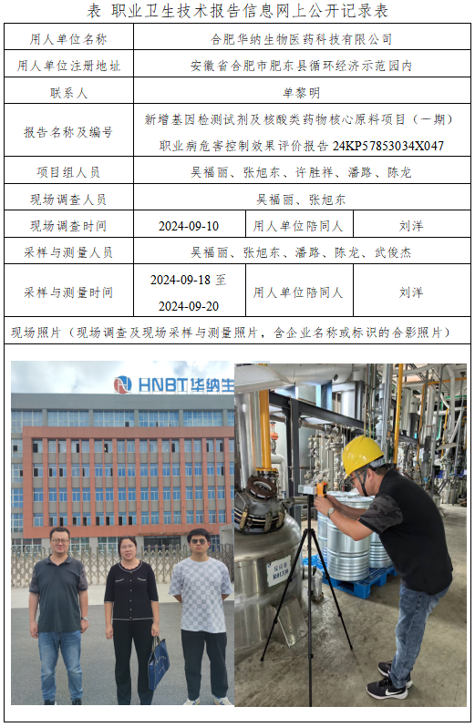 合肥華納生物醫(yī)藥科技有限公司新增基因檢測試劑及核酸類藥物核心原料項目(一期)職業(yè)病危害控制效果評價報告