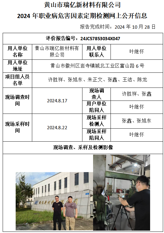 黃山市瑞億新材料有限公司 2024年職業(yè)病危害因素定期檢測(cè)網(wǎng)報(bào)告