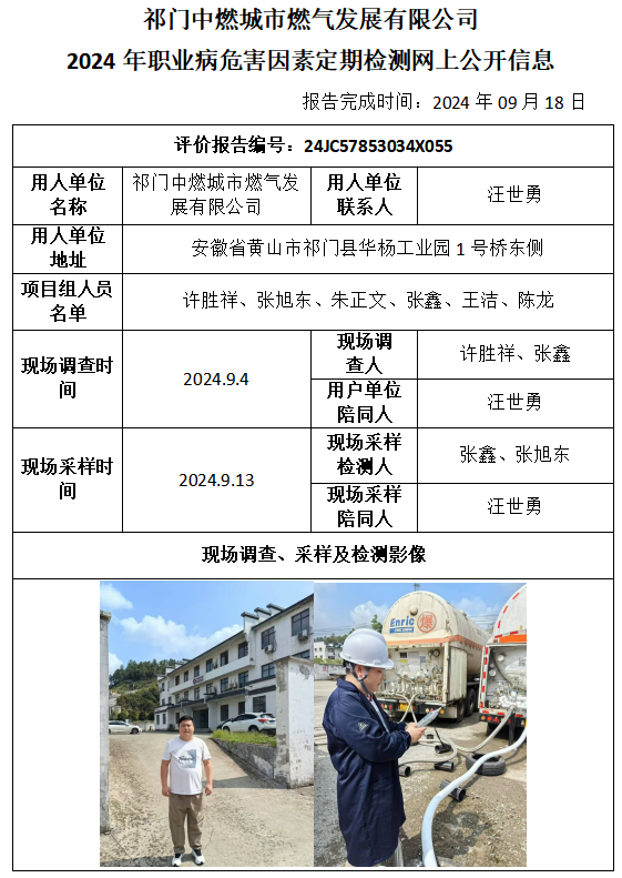 祁門中燃城市燃?xì)獍l(fā)展有限公司 2024年職業(yè)病危害因素定期檢測(cè)